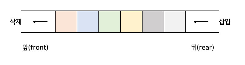 위의 그림과 같이 한쪽에서는 삽입만 이루어지고 반대방향에서는 삭제만 이루어지는 형태의 자료구조를 큐라고 한다.