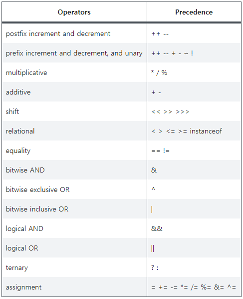 연산자의 우선순위는 매우 중요하다. 연산자의 우선순위에 따라서 바이트 코드에서 후위 표기식으로 변환되어 코드가 나타나기 때문이다. 다음 표는 위에 있을 수록 우선 처리되는 연산이다.