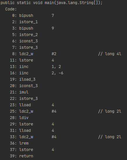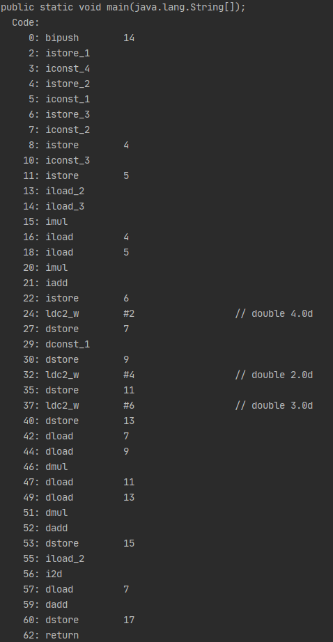 ** 연산자와는 전혀 관련 없는 부분이지만 jvm에서 local variable에 값이 저장될 때 4byte를 기반으로 해당 위치를 저장하는것을 깨달았다. 저번 스터디 시간에 깨우쳤어야 하는 것이었는데 미처 짚고 넘어가지 못 한 점이 아쉽다. (22 ~ 30)의 store 과정을 보면 이해할 수 있다.)