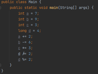 += -= *= /= %= , &= , |= , ^= , >>= , <<= , >>>=